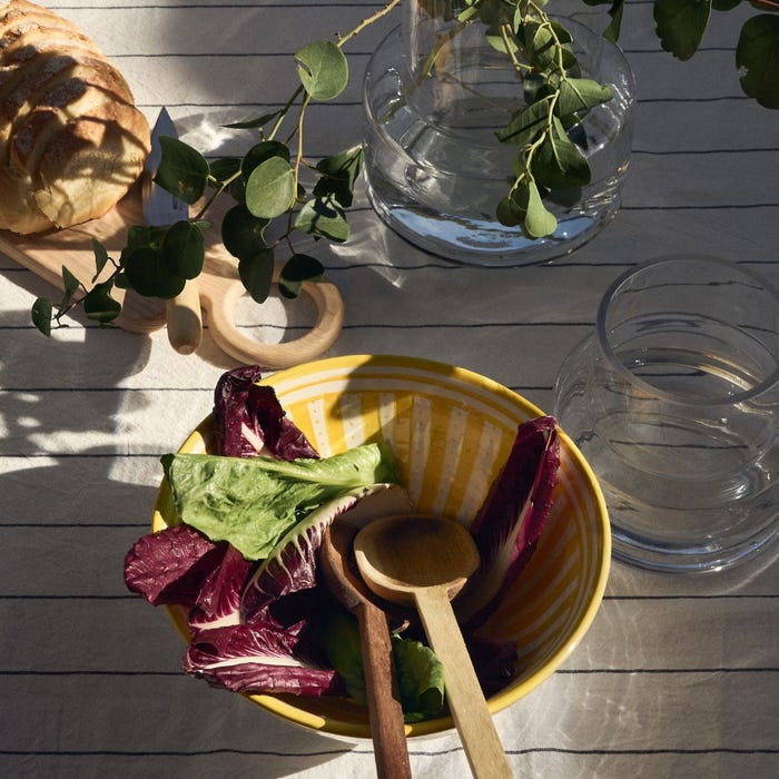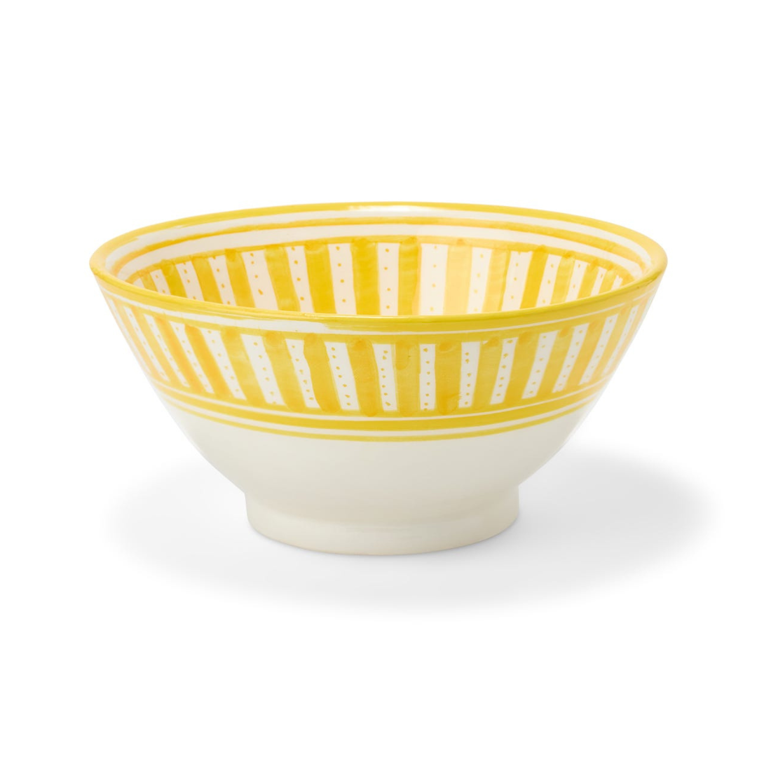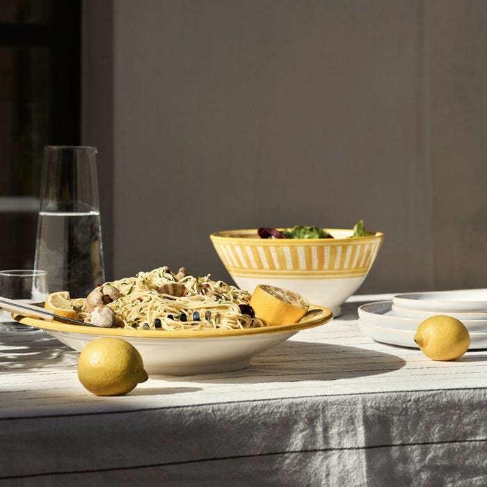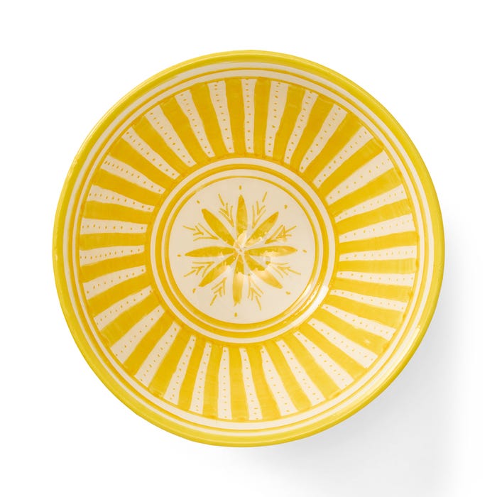 Unikt serveringsfat i vit lera, handmålat med blyfri färg i varmt gult. En tidlös detalj som lyfter både vardagsdukningen och festbordet. Matcha gärna med andra delar i serien. Tål diskmaskin och mikrovågsugn. Finns i flera färger.